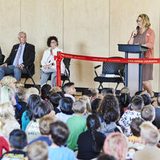 On September 20, 2022, the Abbotsford Board of Education hosted the official grand opening event of Irene Kelleher Totí:ltawtxw, the newest elementary school in the Abbotsford School District. Over 100 guests - including school trustees, government officials, district staff, students, and various community members - were in attendance to commemorate this exciting day, learn more about the building process and the history of the school's namesake, Irene Kelleher.